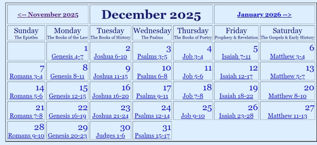 Reading through the Bible is a big challenge. Reading a little bit each day makes it a little easier. We are reading through the Bible together this year. Here is a handy calendar to help.